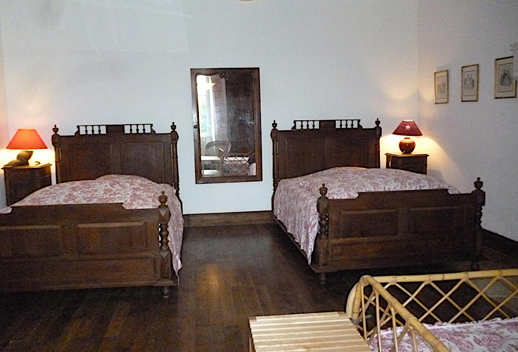 2 lits 125, 1 lit 90, armoire, penderie, pose bagages, 2 fauteuils rotin.